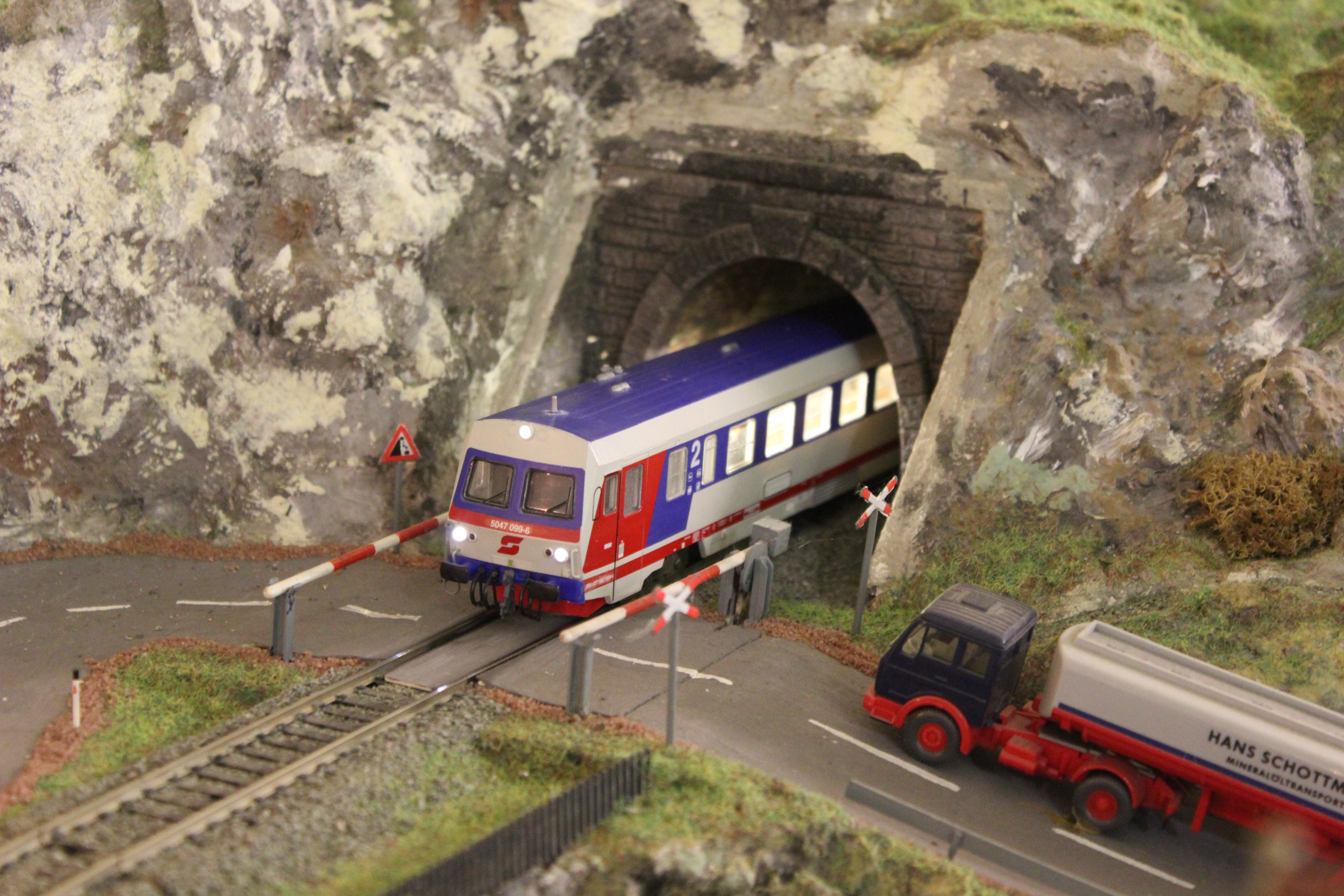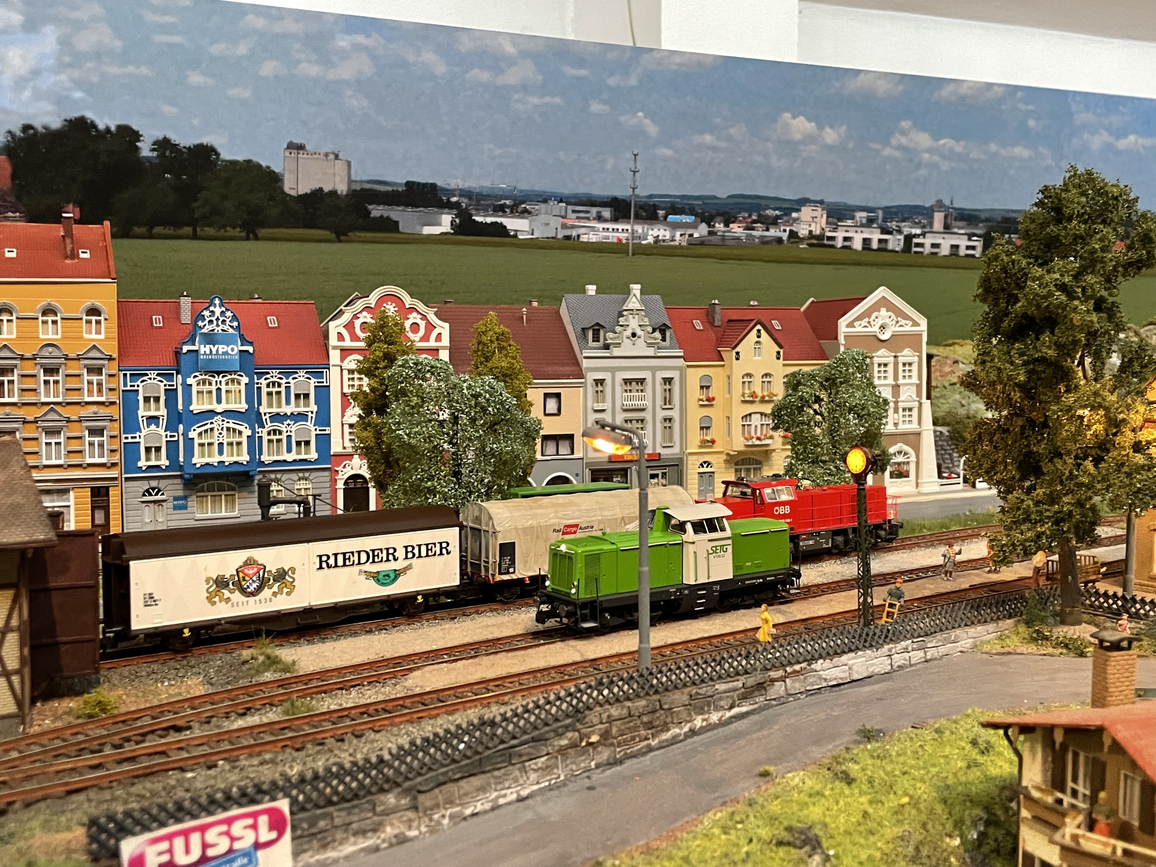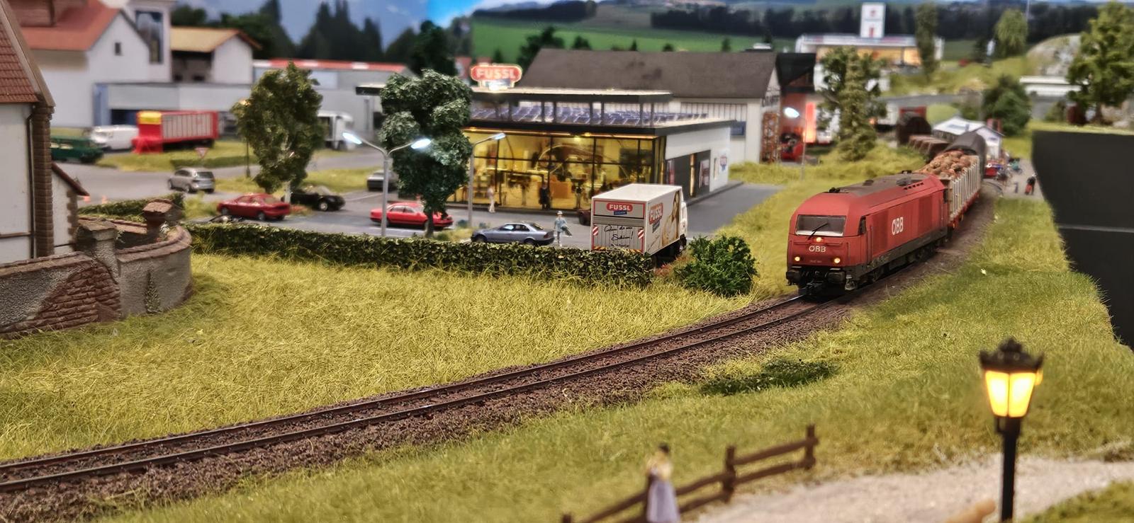 Ab dem Jahr 2003 wurde mit der Planung der Anlage unter der Federführung des seinerzeitigen Obmanns Ing. Kurt Fichtinger begonnen. Auf der Anlage sollte eine zweigleisige Strecke, im sichtbaren Bereich mit Oberleitung, eine Strecke mit der Schmalspurbahn und das Faller Car System enthalten sein. Die Planungen wurden immer wieder, auch noch während des Baus, geändert. Im Jahr 2005 wurde schließlich mit dem Bau des Grundgestells begonnen. Dabei wurde auf eine leichte Bauweise und gute Zerlegbarkeit geachtet. Bis zur Modellbaumesse 2007 war der Bau der zweigleisigen Strecke fertig gestellt, so dass eine Ausstellung möglich war. Diese Strecke war von Anfang an auf digitalen Betrieb ausgelegt. Die Detailgestaltung der Anlage ging dann langsam vor sich und wurde auf dem linken Schenkel begonnen, wo die Strecke ein Volksfest umrundet. Die Besucher der Modellbaumessen in den folgenden Jahren konnte man das langsame Wachsen der Anlage verfolgen. Nachdem 2012 das Problem der Streckenführung der Schmalspurbahn auf der rechten Seite gelöst war, konnte eine Fertigstellung der Anlage bis zur Modellbaumesse 2013 in Angriff genommen werden. Im Frühjahr und im Sommer wurde zielgerichtet an der Anlage gearbeitet. Eine schwere Krankheit zwang unseren Obmann im Sommer zur Niederlegung seines Amtes. Trotzdem gingen die Arbeiten unvermindert weiter. So gelang es mit letzter Anstrengung die Anlage zur Messe landschaftlich fertig zu stellen. Auch das Faller Car System funktionierte, die Schmalspurbahn leider nur auf einer Rumpfstrecke im sichtbaren Bereich. Nicht fertig wurde auch die elektrische Steuerung im linken Bereich. Geplant war noch der Kauf einer Hintergrundkulisse zur Verbesserung der Tiefenwirkung. Es hat sich aber gezeigt, dass wir auf der Anlage zu viele Punkte verwirklichen wollten und dabei etwas über das Ziel hinaus geschossen sind. Deshalb wurde die Anlage nach der Modellbaumesse 2013 erst einmal zur Seite gestellt. Die Anlage lagerte seither im Obergeschoss der Halle 4 auf der Rieder Messe. Soweit elektronische Teile bei Weiterbau der Winteranlage gebraucht wurden, wurden diese ausgebaut. Eine Entscheidung über das Schicksal der Anlage musste getroffen werden, seit dem feststand, dass die Halle 4 einem Neubau einer Volleyballhalle weichen musste. Wir haben uns daher 2021 entschlossen, die Anlage bei Willhaben zu verkaufen. Das ist nun auch geschehen.