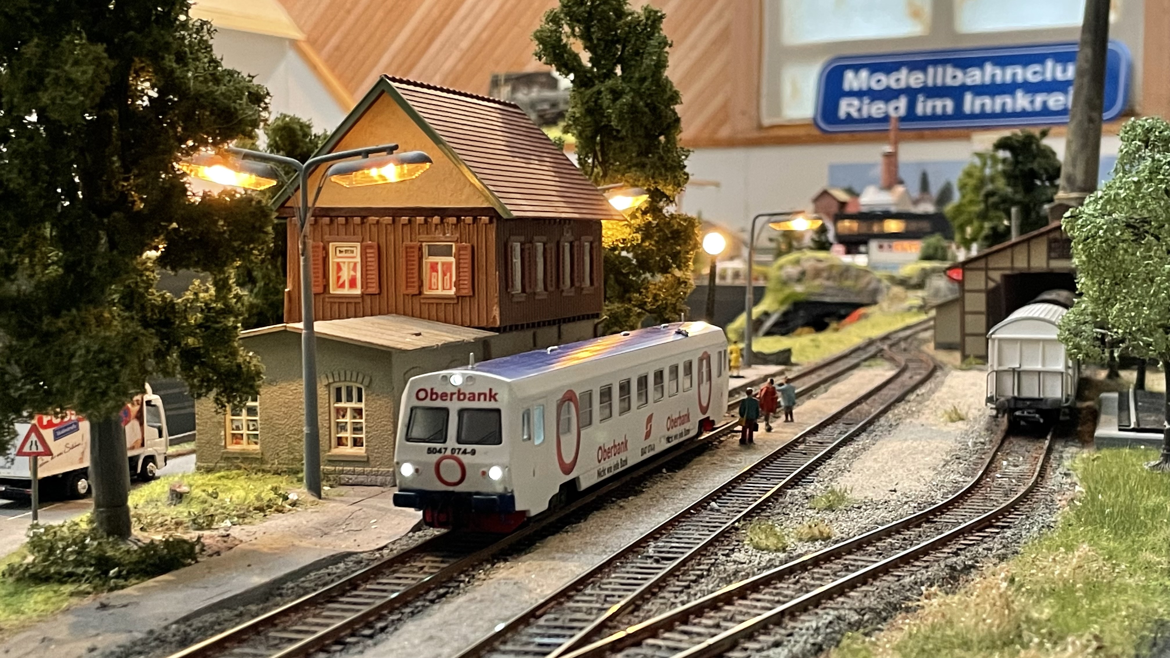 Durch Kontakte zum damaligen Leiter der RAIKA Ried i. I., Mag. Fischer, und zur Rieder Messe konnten die ersten Orte für eine Ausstellung fixiert werden. Es fehlte nur noch die Anlage. Hier half uns unser damaliger Schriftführer Mag. Jürgen Siebeneichler, der seinerzeit umfangreiches Märklin Material, verpackt in Schachteln, liegen hatte. So wurde im Haus von Ing. Weis in der Salzburger Strasse, das sich damals im Bau befand, mit Hochdruck am Bau dieser Märklin Anlage gearbeitet. Die Anlage wurde in L-Form gebaut, wobei sich im unteren Bereich eine zweigleisige elektrifizierte Strecke – im sichtbaren Bereich mit Sommerfeldt Oberleitung – mit einem umfangreichen Schattenbahnhof befand. Von dieser Strecke zweigte eine eingleisige nicht elektrifizierte Stecke nach oben zu einem sichtbaren Bahnhof ab. Diese Strecke hatte oben einen eigenen Rundkurs mit einem Schattenbahnhof. Legendär ist heute noch die Fertigstellung der Landschaft mit einem Farbspray durch unser Mitglied Josef Huber. Die erste Ausstellung fand zu Weihnachten 1983 in den Räumlichkeiten der RAIKA Ried i. I. statt. Einem größeren Publikum wurde die Anlage dann auf der Frühjahrsmesse 1984 gezeigt, wobei die Anlage zuvor noch etwas verfeinert wurde. Nach der Weihnachtsausstellung 1985 – wieder in den Räumlichkeiten der RAIKA Ried i. I. - wurde die Anlage wieder zerlegt, da die Räume nun selbst von der Bank benötigt wurden.